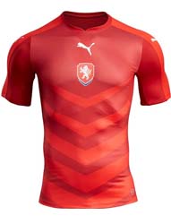 Seit Januar 2016 kann man das neue Tschechien Trikot 2016 kaufen. Es kommt wieder von Puma und ist rot mit dem Emblem des Tschechischen Fußballbundes in der Mitte. Darunter finden sich sechs quer verlaufende geknickte Streifen, die nach unten hin dicker werden. Das große Puma Emblem ist unter dem roten Rundkragen mittig angebracht.